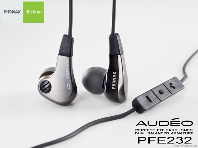 Phonak Audeo PFE 232 – Completely iPhone ready PFE 232 is Designed in Switzerland with an inline microphone and a multifunctional button control for iPhone Siri, music and calls. It has two high precision balanced armature drivers.