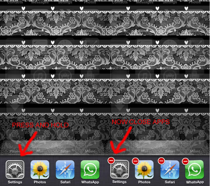 It’s very simple; double tap the home button of your iPhone and the bottom bar will appear, from there hold your finger on any app you see there and wait for just 1 second, after that you will see all the running apps on the bottom bar are jiggling. Then you can close them one by one by tapping on the red dash (-) icon on the top left corner of the jiggling app and give your battery a little relief. Check out below pictures and video for details of how to close apps on iPhone;
