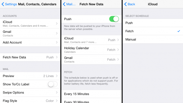 Push email continuously fetches new messages, which can be battery-intensive. Switch to manual email fetching or set it to fetch emails at longer intervals. Go to Settings > Mail > Accounts > Fetch New Data and choose either Manual or a less frequent fetching schedule.