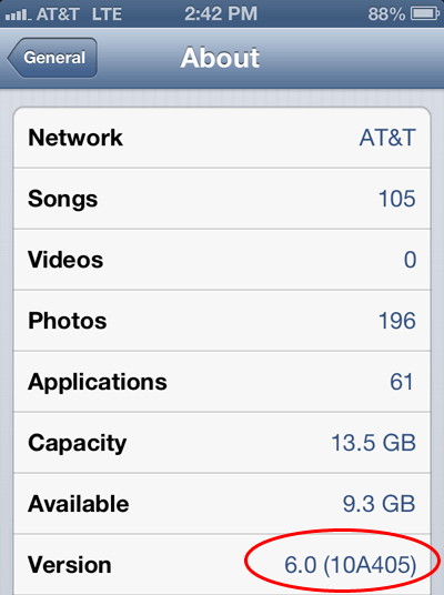 • Step 5. This ‘About’ tab will bring you to a page with a bunch of information related to your phones storage and operation information. Scroll down while ignoring most of the information until you find the subcategory labeled ‘Version.’