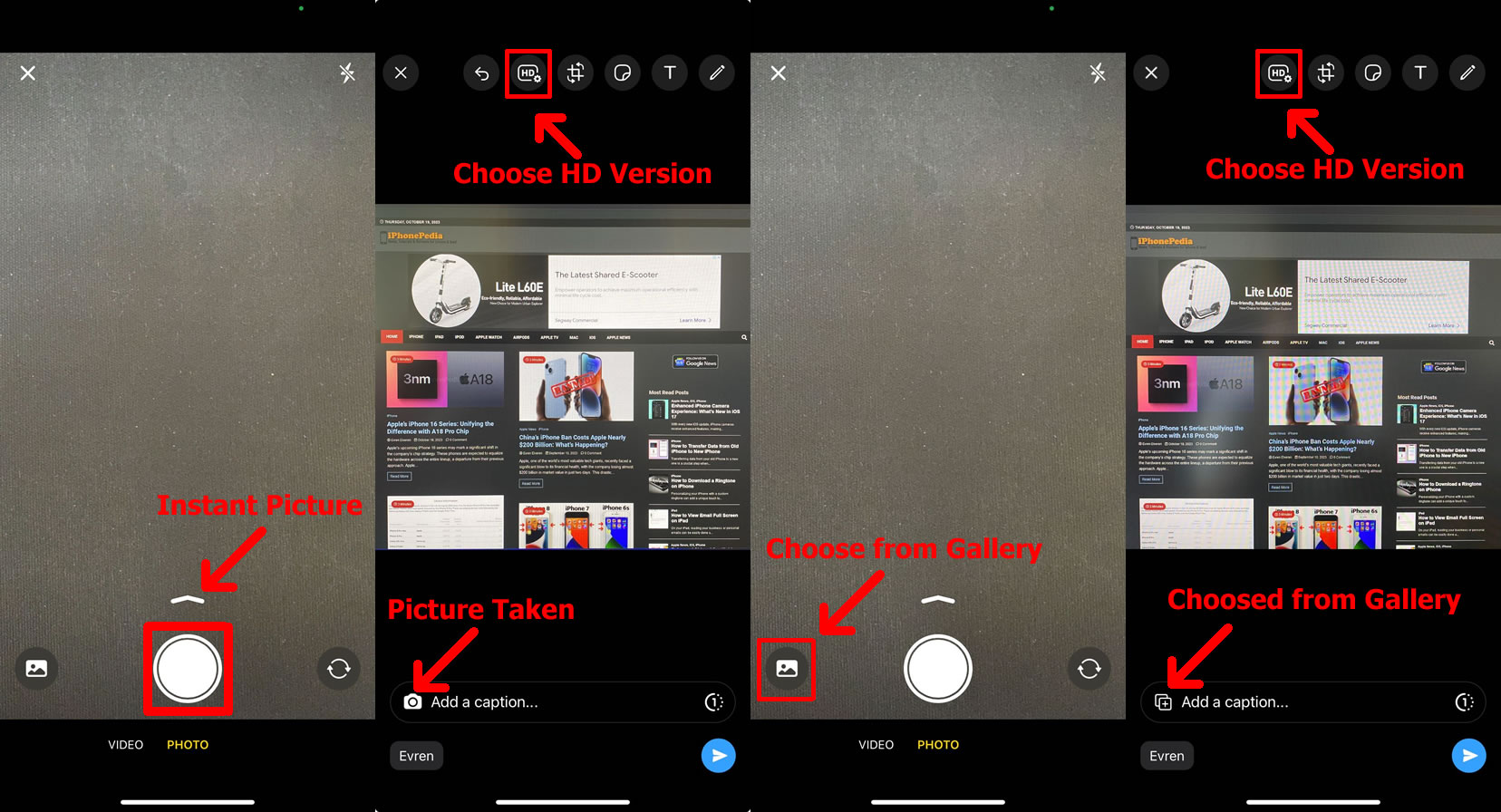 - Select the photo you want to send in HD from your library or capture one instantly.