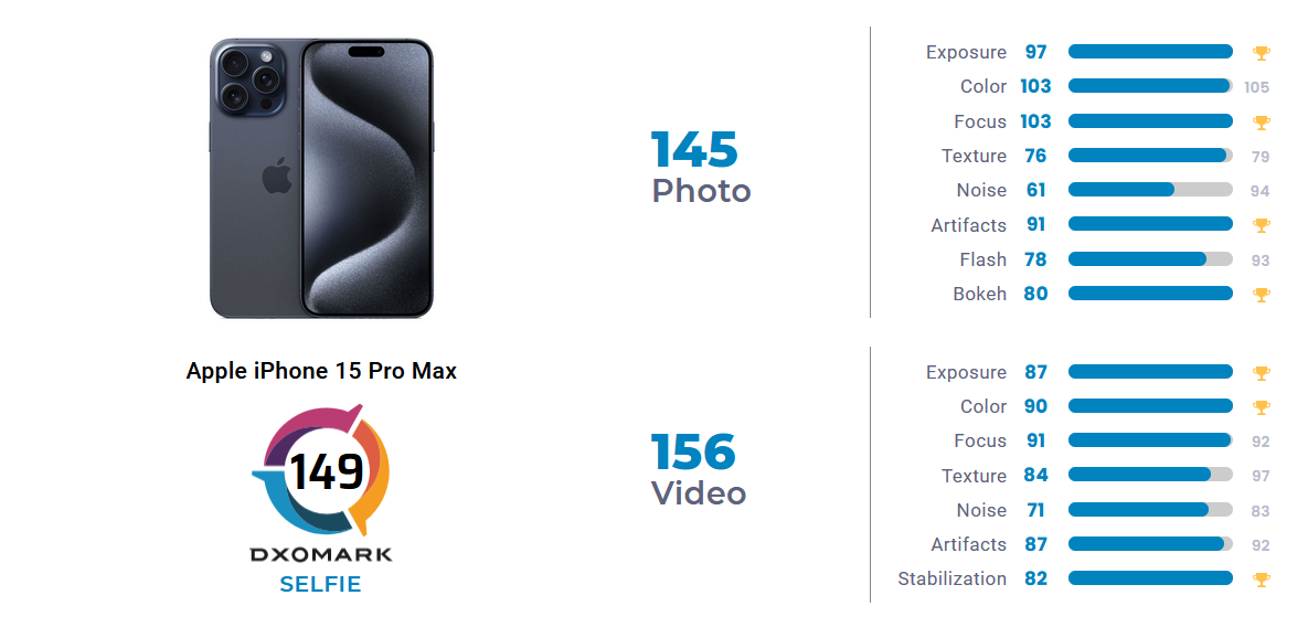 Last year, the iPhone 14 Pro Max impressed with a score of 145 for selfie performance, topping the charts. This year’s release, the iPhone 15 Pro Max, takes this excellence to the next level. DxOMark’s assessment awards the iPhone 15 Pro Max a leading score of 149 points.